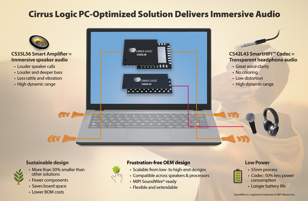 シーラス・ロジック、PC市場に向けて没入型のオーディオ体験を提供するスマート・アンプと低消費電力コーデックを発表