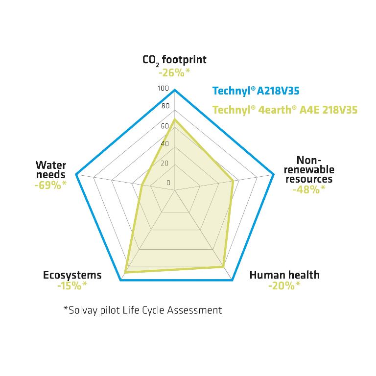 Move 4earth® 担当プロジェクト・ディレクターのリチャード・ボードンは、「Technyl® 4earth®はポリアミド部品における環境への影響を、これまで成しえなかったレベルにまで、大幅に低減させることができます。原材料入手から製品出荷までの工程をソルベイで調査したところ、従来のTechnyl®コンパウンド材料と比較して、カーボン・フットプリントを1/4にまで削減、再生不能資源の消費量を半減、水の使用量を2/3以上削減、といった目覚ましい結果が示されました。」とコメントしています。