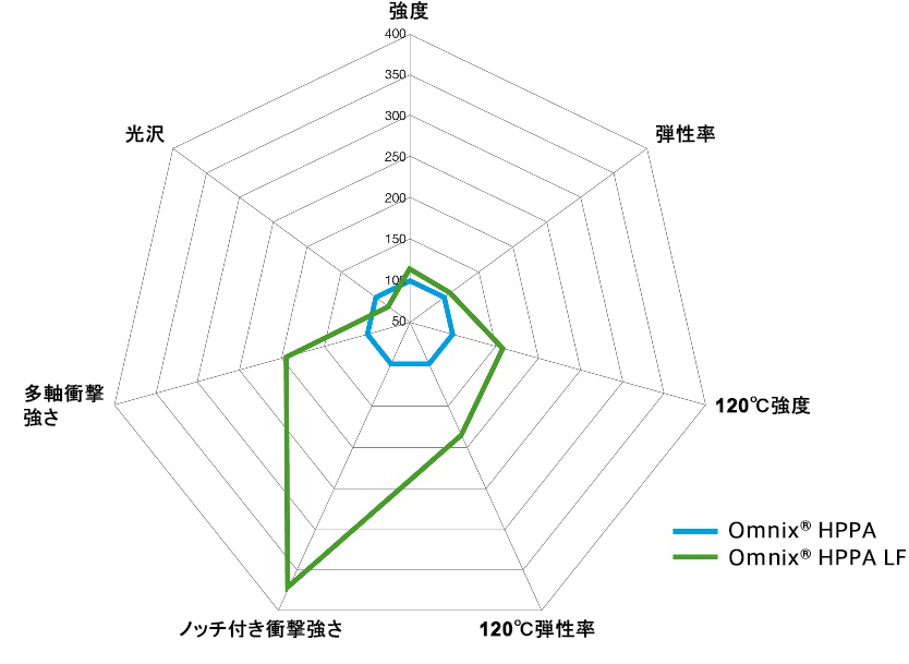 さらにOmnix™ LFグレードは、熱および湿度の影響を受けても高い特性保持効果を発揮します。標準的なガラス充填HPPAと比較して、LFT技術は23℃での剛性を10~15パーセント増大させますが、母材樹脂のガラス転移温度をはるかに上回る120℃での剛性は85パーセントも増大します。