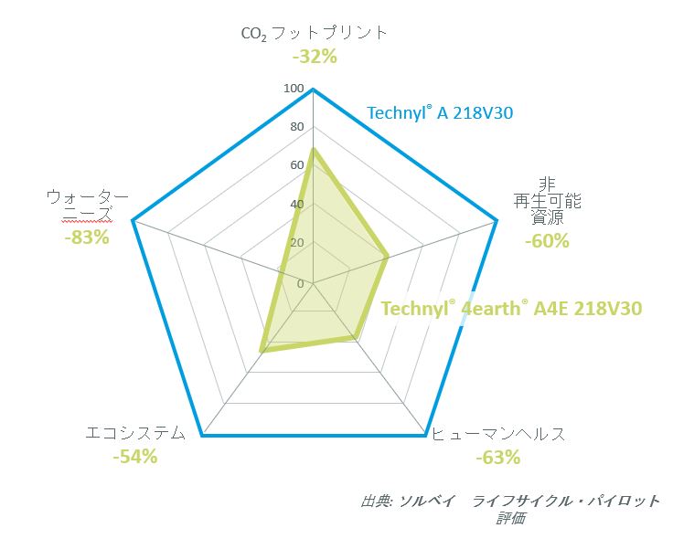 • Technyl® 4earth®の工場での原材料入手から製品出荷までの環境フットプリントは、高品質Technyl® PA6.6と比較して著しく削減されています。