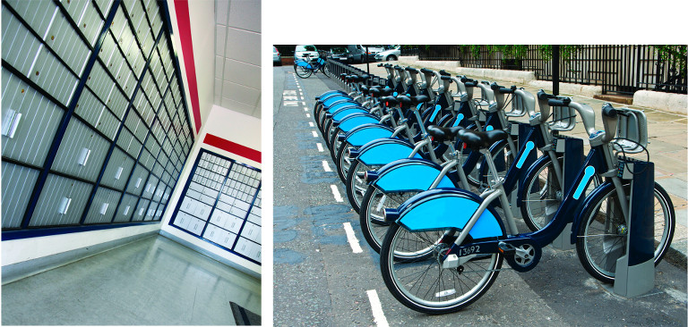 従来のATM、小売・セルフチェックアウトシステムから用途範囲を拡げるセルフサービス向けエンクロージャー・キオスクの例:小荷物ロッカー(左)、レンタサイクル(右)