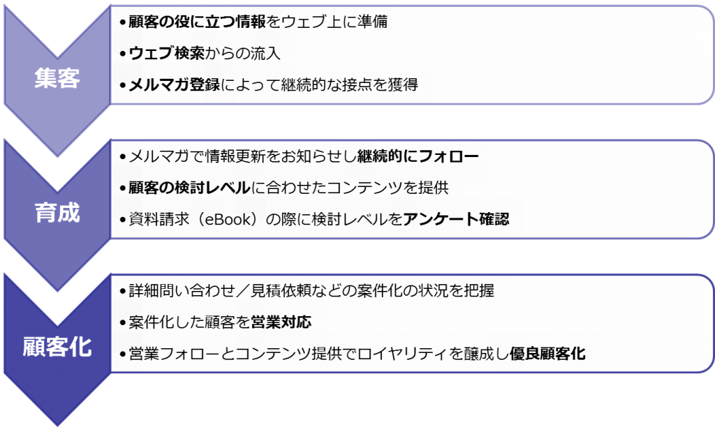 見込み客を集め、継続的なフォローで育成し、顧客化するまでのプロセス