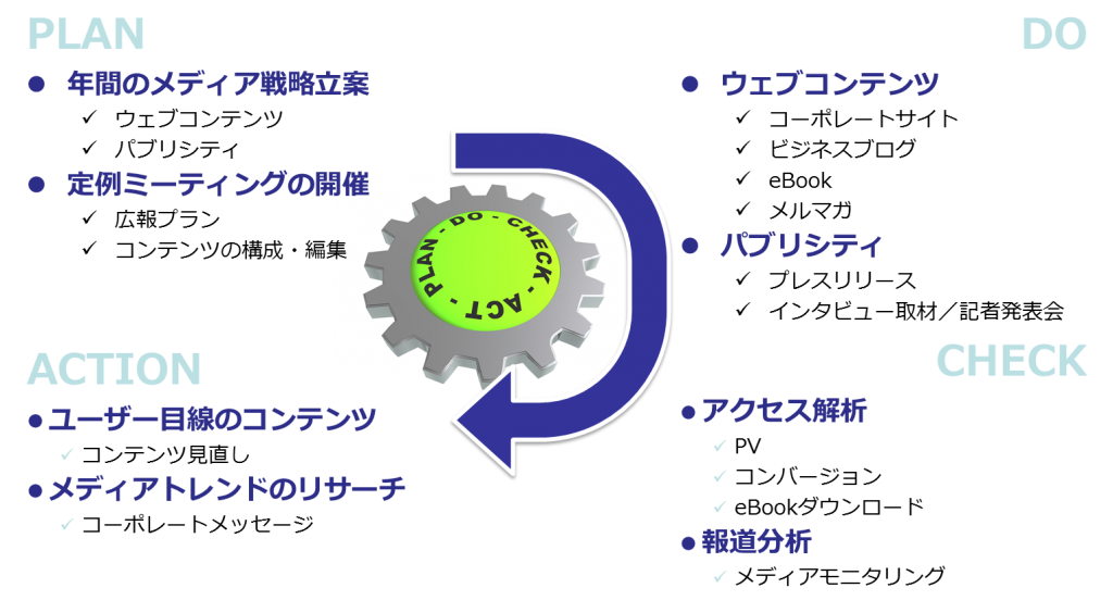東京PRは広報活動と同様、マーケティング活動においても現場担当者の声を重視します。ヒアリングで集めた現場の声/顧客の声と併せ、ウェブへのアクセス状況やプレスリリースの予定などを見ながらメルマガ/ブログ記事/eBookといったコンテンツのプランを立てます。加えて2~3ヶ月先までのエディトリアルカレンダーを作成することで、コンテンツ制作の進行を管理します。